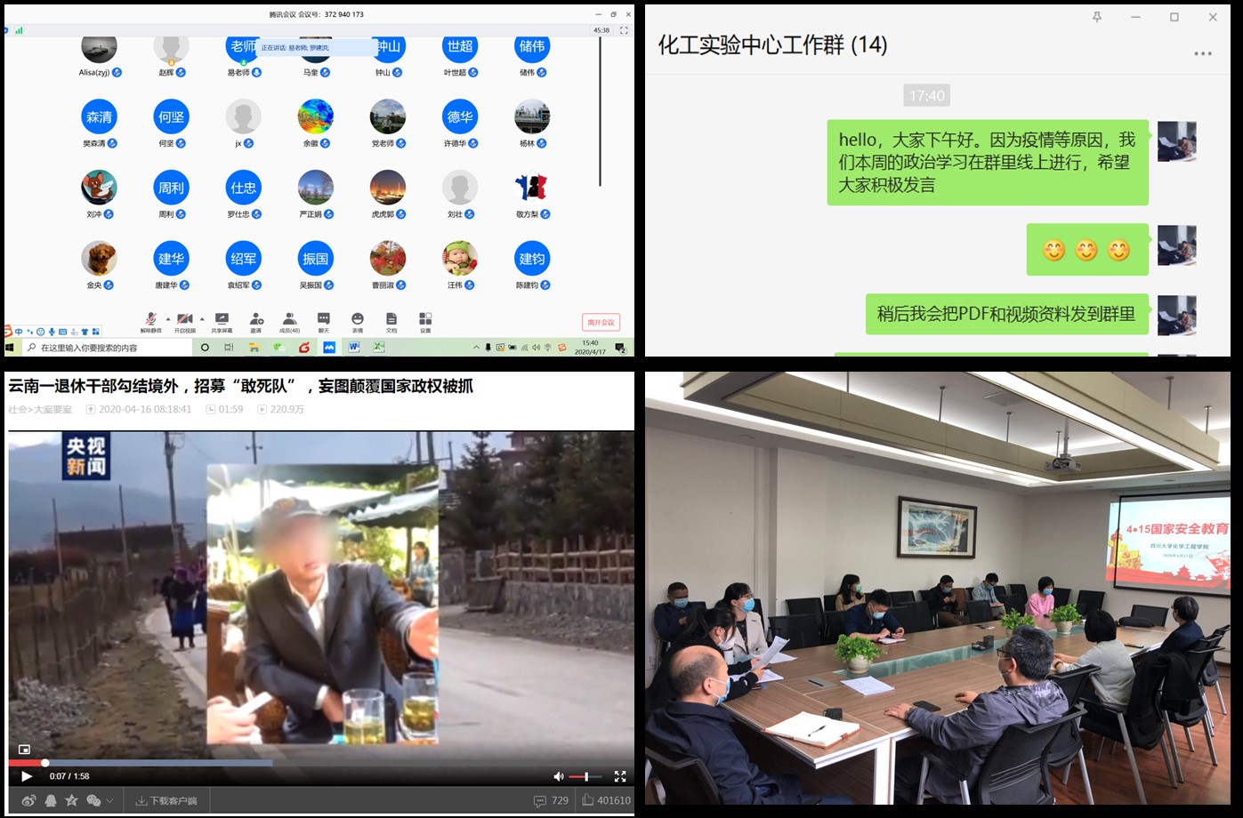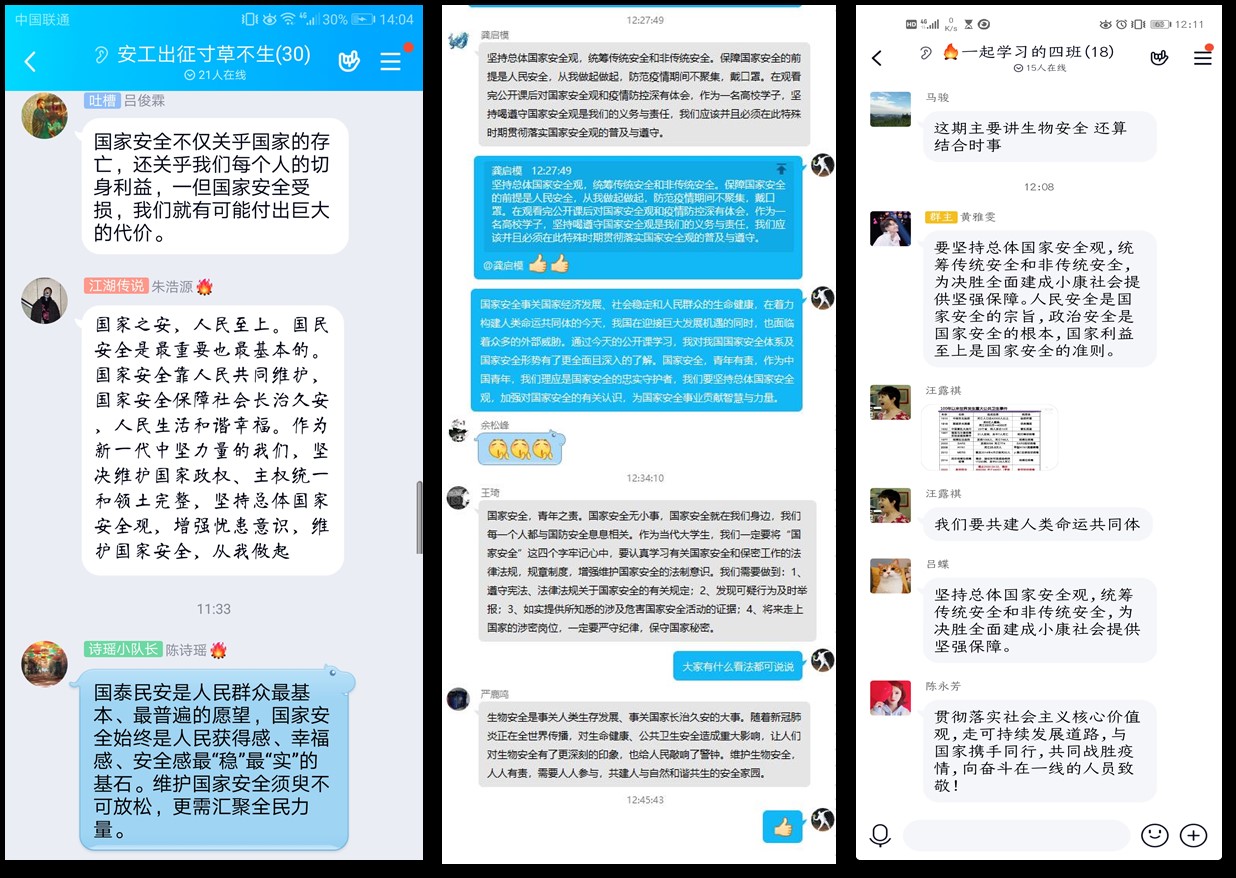 今年教育部一如既往地开展了“千万员工同上一堂国家安全教育课”主题活动。公司工艺专业、生工专业、冶金专业、制药专业、过控专业、安全工程专业的所有班级团支书组织同学于4月14日线上观看了教育部录制的2020年全民国家安全教育日高校公开课,并就公开课内容开展了主题“云”班会进行线上讨论交流学习。同学们都有感而发,通过公开课的学习,对国家安全有了更深的认识和理解,增强了国家安全意识和社会责任感。并承诺在今后的学习生活过程中,会自觉维护国家安全、严格保守国家秘密,为构建安全、和谐、稳定校园而努力。