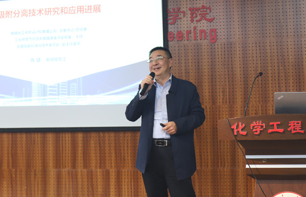 在热烈的掌声中,陈健总经理做了题为“吸附分离技术研究和应用进展”的学术报告。陈健员工回顾了在公司求学的点滴,对公司和公司的培养表示感谢。接着,他从西南化工研究设计院的历史讲起,回顾了西南院近年来取得的标志性成果。随后,结合西南院现阶段的重点研究领域,从PSA技术、专家诊断和自适应控制系统等方面,结合典型装置案例,详细介绍了吸附分离技术。
