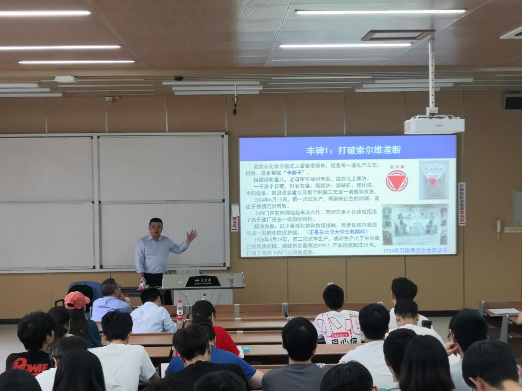 报告会中,侯琳熙教授从年少求学、学成报国、爱国情怀、高尚品德、鞭策前行五个方面,全景式的带领大家回顾了侯德榜先生的一生。通过介绍打破索尔维垄断、撰写《苏打之制造》、创办第一座大型化工联合企业、创制侯氏制碱法、发明碳化法合成氨制碳酸氢铵、传世之作《制碱工学》撰写等科研丰碑功绩,向同学们阐释了侯德榜先生作为近代爱国科学家科技报国、创新兴国、献身科学事业的奉献精神。通过分享旧时期“留美见闻盼图强”、抗战期间“不惧威胁担大义”、解放时期“立排众议争赔偿”、建国前夕“坚拒高薪归祖国”、文革期间“呕心沥血留遗憾”等时期的奋斗故事,分享了侯德榜先生制出中国人自己纯碱的真实感人故事和爱国情怀。