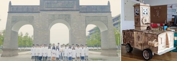 参赛当天,在海报及视频展示环节,“清一色”团队制作的1分钟短视频从众多视频中脱颖而出,独特的外观造型和自动化控制装置更是吸引了大批参赛师生前来取经。小车整体采用木制结构,采用燕尾榫和直榫连接,车体设计融合工业风和蒸汽朋克风,车身装饰零部件包含齿轮、仪表等工业元素和太阳神鸟、熊猫等成都文化标识,体现了四川的地域文化。在性能竞赛中,团队五名成员克服压力,在有限的准备时间内顺利制备并组装好电池、配制出碘钟反应试剂并加以验证和调整,并最终取得了性能比赛第六名的成绩。