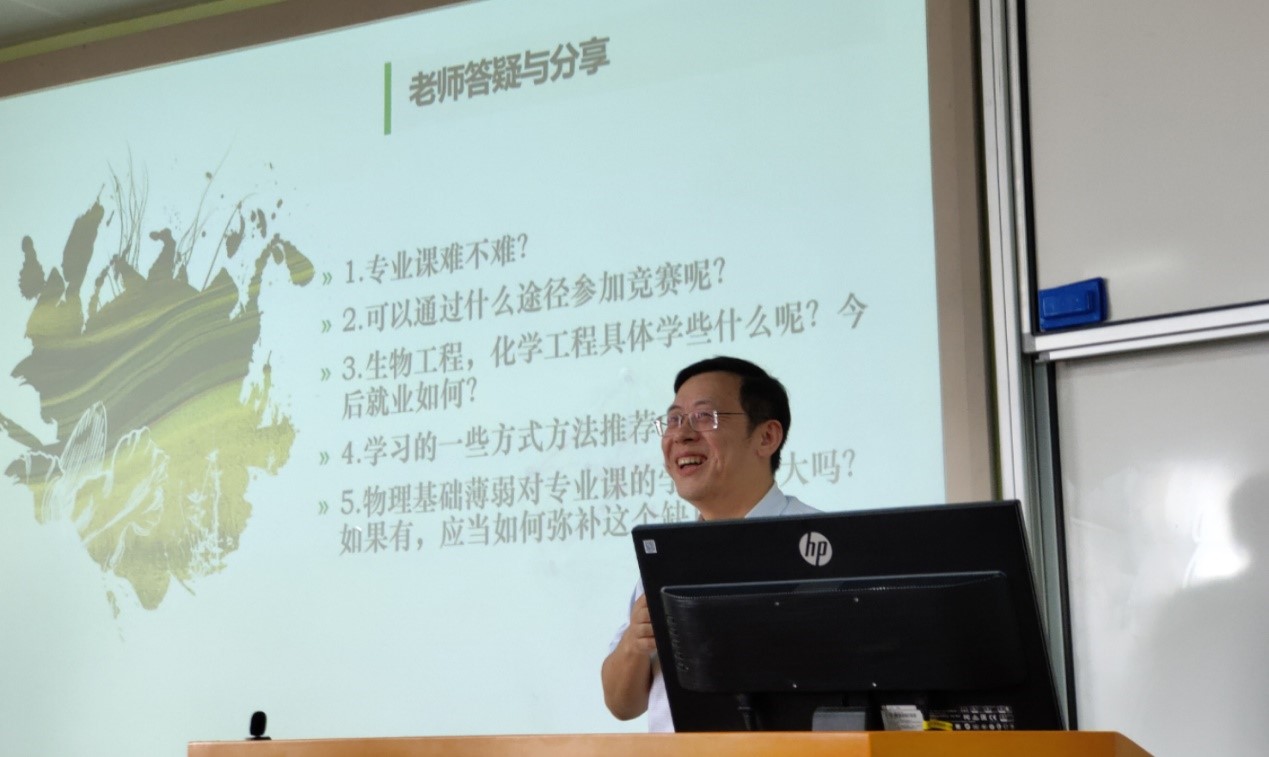 接下来就是两位班主任老师的答疑解惑与分享环节了。两位老师都深情回忆了自己的老员工活以及自己与化工的缘分。彭老师与同学们讲述了身为“川三甲”的故事,回忆川大与科大合并初期的冰与火,毕业合影时理科与工科服饰的区别等微妙的细节。彭老师还讲到自己“曲折”的学习经历,在新加坡感受到的地域文化差异和浓烈的家国情怀以及后来去到美国留学的丰富感受,更有在化工这片土地上的勤劳耕耘,硕果累累。杨老师着眼于同学们的老员工活,也分享了自己的“学霸”经历,劝诫同学们“难与不难,其实在于自己”,好好学习始终是老员工的第一要务。