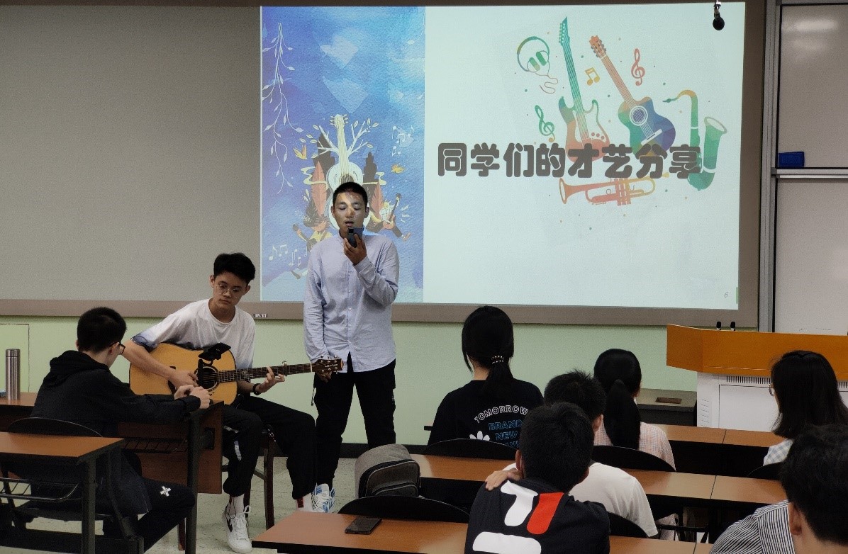 接下来,是乐趣横生的才艺展示环节。刘士博与徐智豪同学合作,为同学们和老师们带来一场音乐盛宴。在吉他清脆的声音和刘同学悠扬的歌声中,同学们的情绪更加高涨。紧接着的rap表演则更将气氛带动起来,老师同学们都鼓掌称赞。