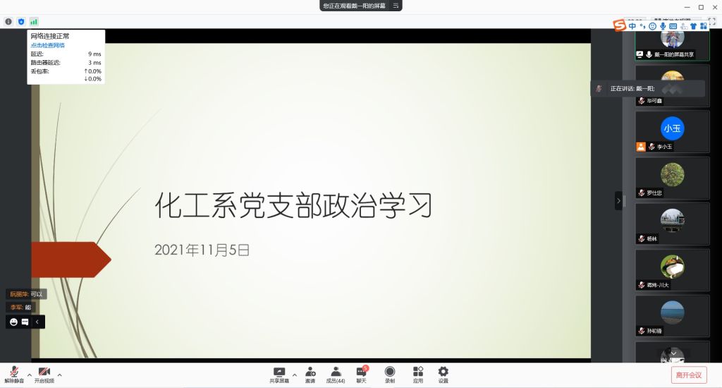 在成都市新冠病毒防疫形势下,Mksport体育app官网入口化学工程系全体教师于2021年11月5日下午通过腾讯会议开展了的政治学习和组织生活。化学工程系党支部书记谢锐同志主持了本次政治学习和组织生活,系统工程党小组戴一阳同志负责领学了政治学习文件,系主任袁绍军同志进行了业务工作研讨。