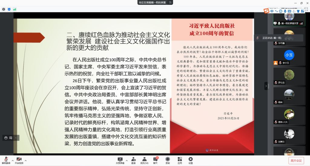 戴一阳同志采用新闻视频和PPT的形式,提纲挈领地带领大家学习了《习近平总书记在中共中央政治局第三十四次集体学习时强调,把握数字经济发展趋势和规律,推动我国数字经济健康发展》、《习近平总书记致信祝贺人民出版社成立100周年强调,赓续红色血脉为推动社会主义文化,繁荣发展建设社会主义文化强国作出新的更大的贡献》、《习近平总书记致人民出版社成立100周年的贺信》等重要文件,重点讲解互联网、大数据、云计算、人工智能、区块链等技术促进数字经济改革,正在成为改变全球竞争格局的关键力量等问题,并结合自身在互联化工中心的研究方向,详细解读了系统工程技术对数字经济改革的影响。