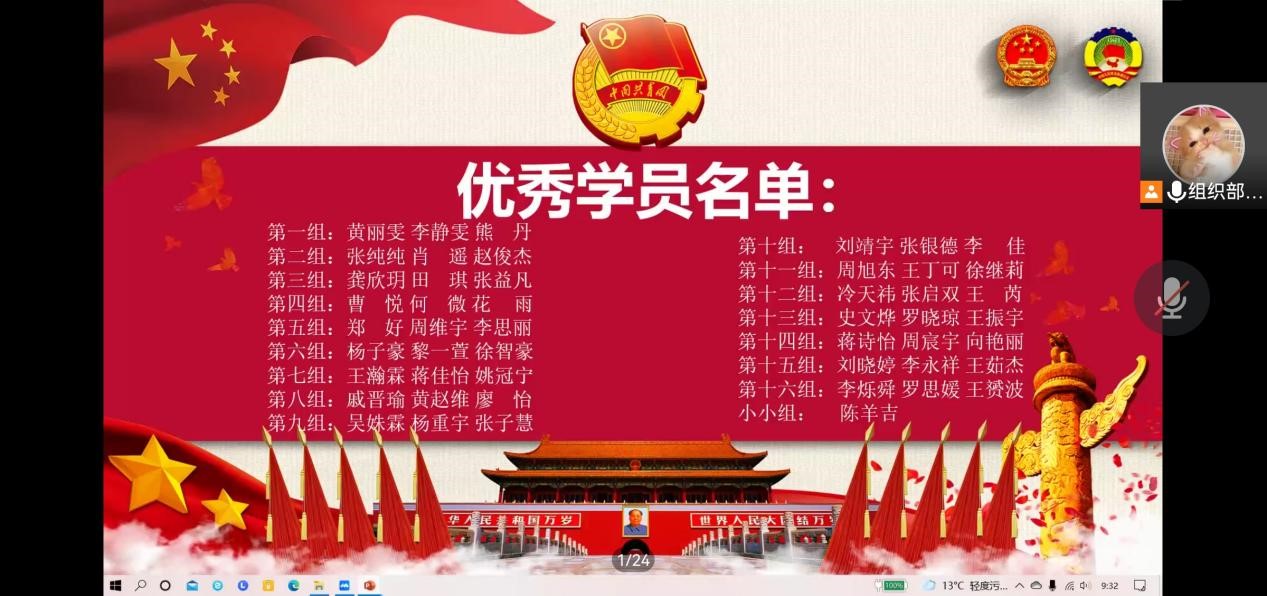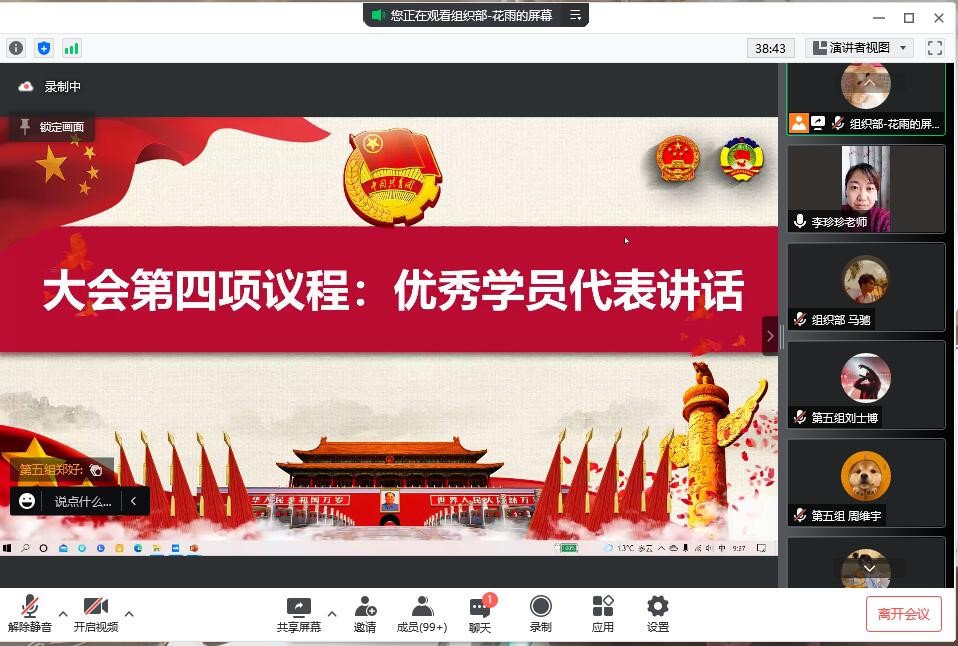 最后,优秀学员代表李佳同学发言,向同学们总结自己的心得体会:庞国伟教授引导我们直观认识党的百年历程,深刻学习党的政治品格;罗杰学长激励我们积极学习先进思想,构建共产党人的精神谱系;赵长生经理由红船精神的传承述说了如何将红船精神融入化工建设;苏德强教授带领我们充分学习了党领导青年发展的百年历程及经验启示,激励我们以史为鉴,笃学笃行。
