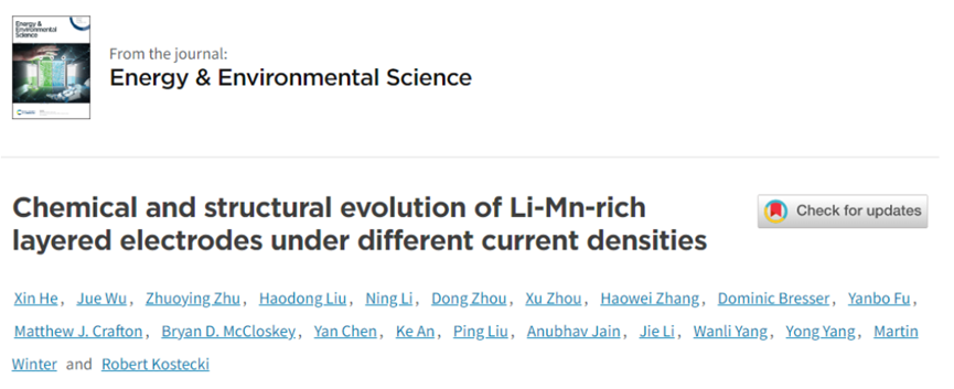 尽管富锂正极有着两种活性氧化还原中心,包括阴离子和阳离子贡献,可以使锂离子电池获得出色的比能量,但它们在不同电流密度下的行为尚未被阐明。近日,公司何欣研究员与美国劳伦斯伯克利国家实验室的Robert Kostecki通过研究不同电流下富锂中的渡金属(TMs)和氧的氧化状态,对他们的氧化还原活性进行比较研究,提出了从Li八面体到Li四面体的结构变化的详细机理,以及氧空位在Li+扩散中的作用。相关研究成果“Chemical and structural evolutions of Li-Mn-rich layered electrodes under different current densities”发表在材料领域国际期刊《Energy& Environmental Science》上,Mksport体育app官网入口何欣研究员为本文共同一作和共同通讯,Mksport体育为本文第一作者单位。