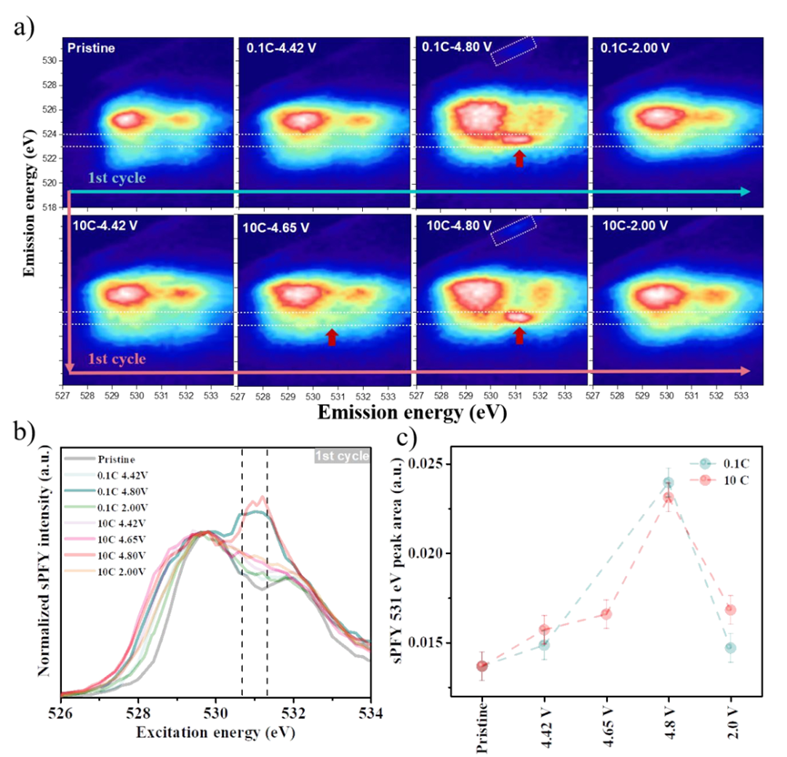 【图1】a)首圈不同SOCs下LMR-NCM电极的mRIXS mapping;b)对应从530.7-531.3eV的发射能量窗口中的sPFY图;c)在0.1C和10C下氧化氧的峰面积变化。