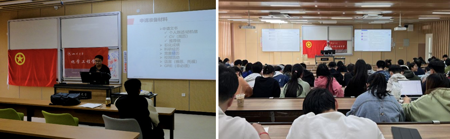 为促进公司学风建设的深入开展,进一步推动良好学风的构成,围绕员工升学深造的发展需求,帮助员工对升学进行自我探索并为自己选择合适发展方向,提升综合竞争力。公司团委和Mksport体育app官网入口“定盘星”辅导员工作室联合举办“升学大讲堂”之“留学+考研”经验分享会,于2023年4月7日下午在江安校区综合楼C座105、104教室顺利落下帷幕。本期“升学大讲堂”邀请嘉宾为2019级廖鑫柯、欧盼、唐宗剑、刘会如、佘希硕;此外,2021级辅导员李珍珍老师、付率老师以及近300名本科生参加本次活动。