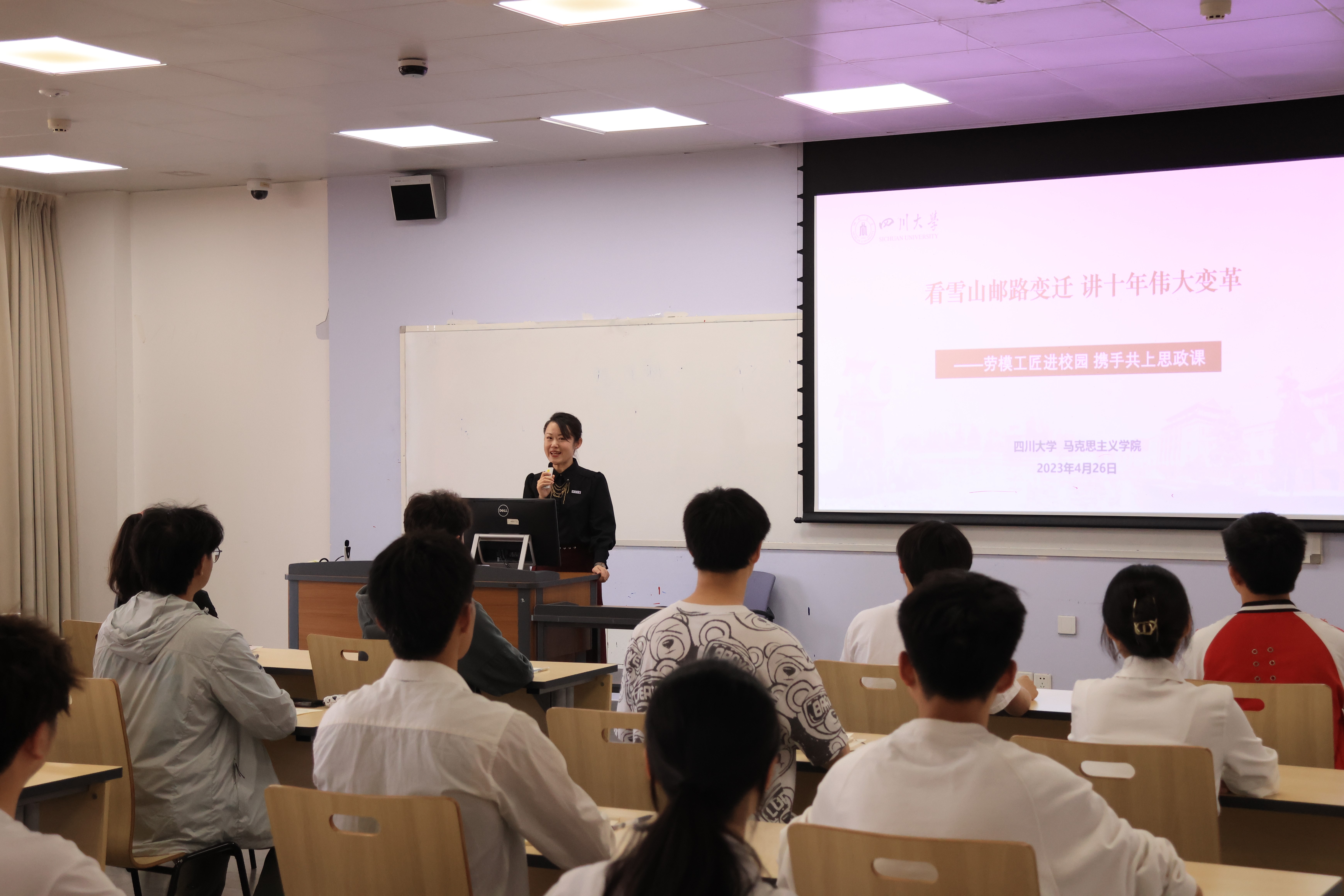 王丽鸽老师则以其美多吉的人生经历为引子,精彩阐述了新时代10年的伟大变革,紧紧围绕“看雪山邮路变迁,讲十年伟大变革”主题进行授课。从身边的劳模工匠先进典型中汲取精神力量,既有活生生的案例,也有系统的阐述,在感受榜样的力量中倾听时代的变革,思政课由小见大的表达,引起了现场学子们的共鸣。江姐班员工邱天谈到,“个人成长和时代发展是相辅相成的,个人成长是时代发展的源动力,而时代发展为个人成长提供了机会。我们要将个人发展融入时代发展中,坚定中国特色社会主义道路,将自我革命融入到社会革命,我们要像其美多吉老师一样发扬钉钉子精神,将自己所学的化工专业知识融入到国家的化工企业,致力于祖国化工领域的发展,注入川大力量。”
