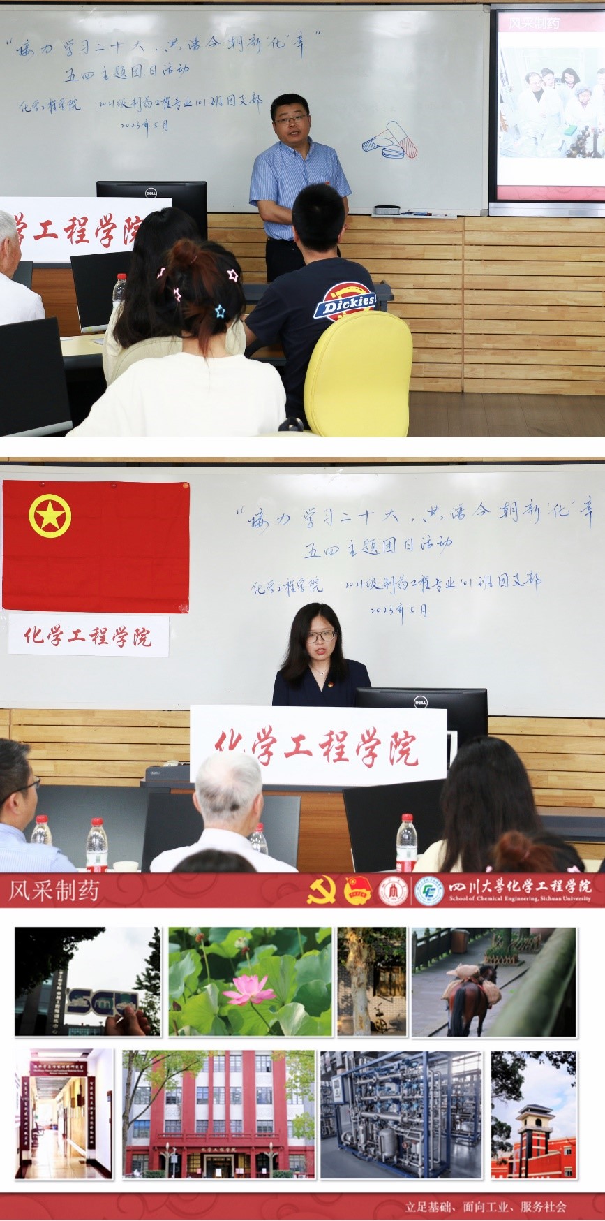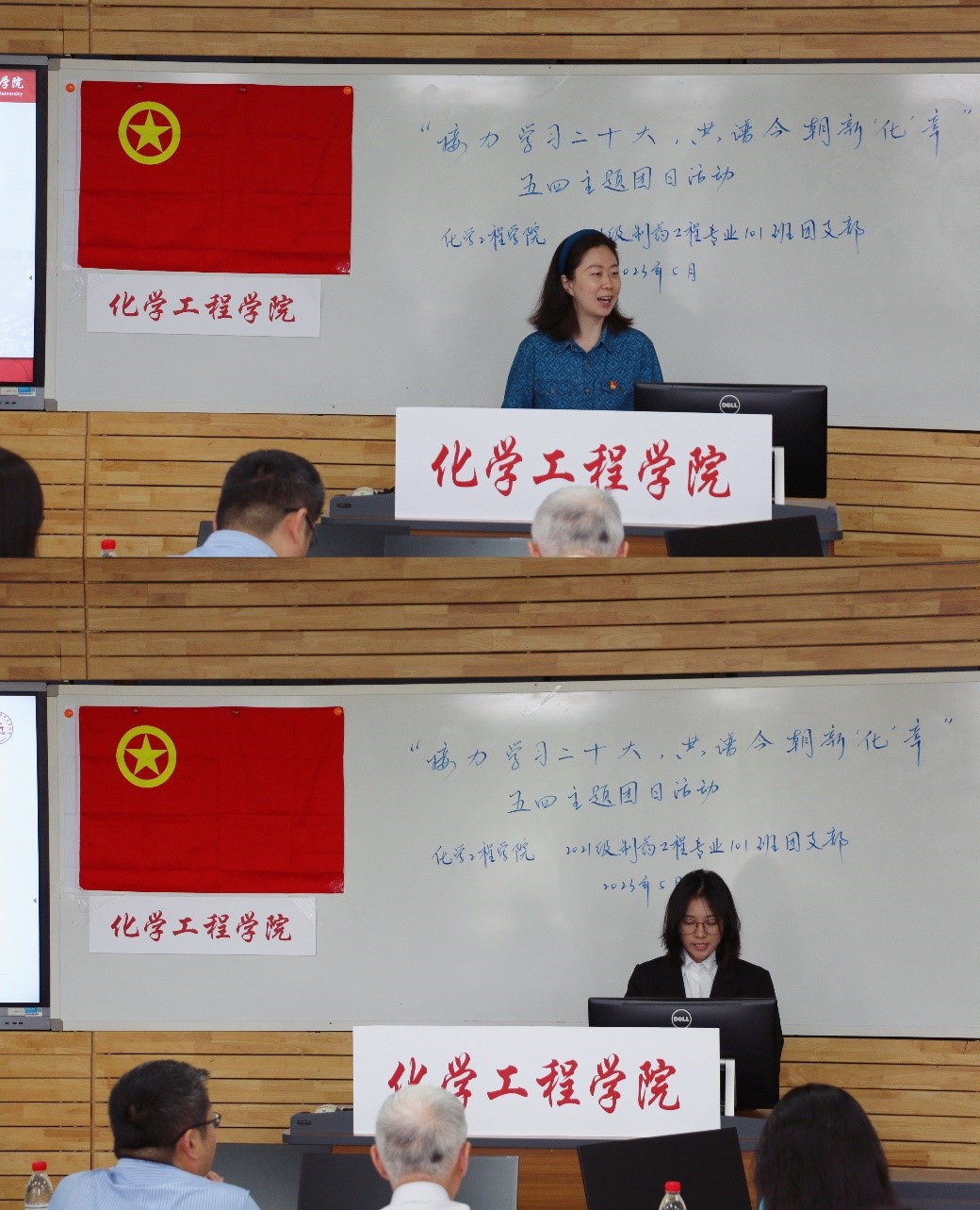 李德富老师(上)分享建院70周年庆红色照片和巨晓洁老师(下)讲解药物制剂科普小故事