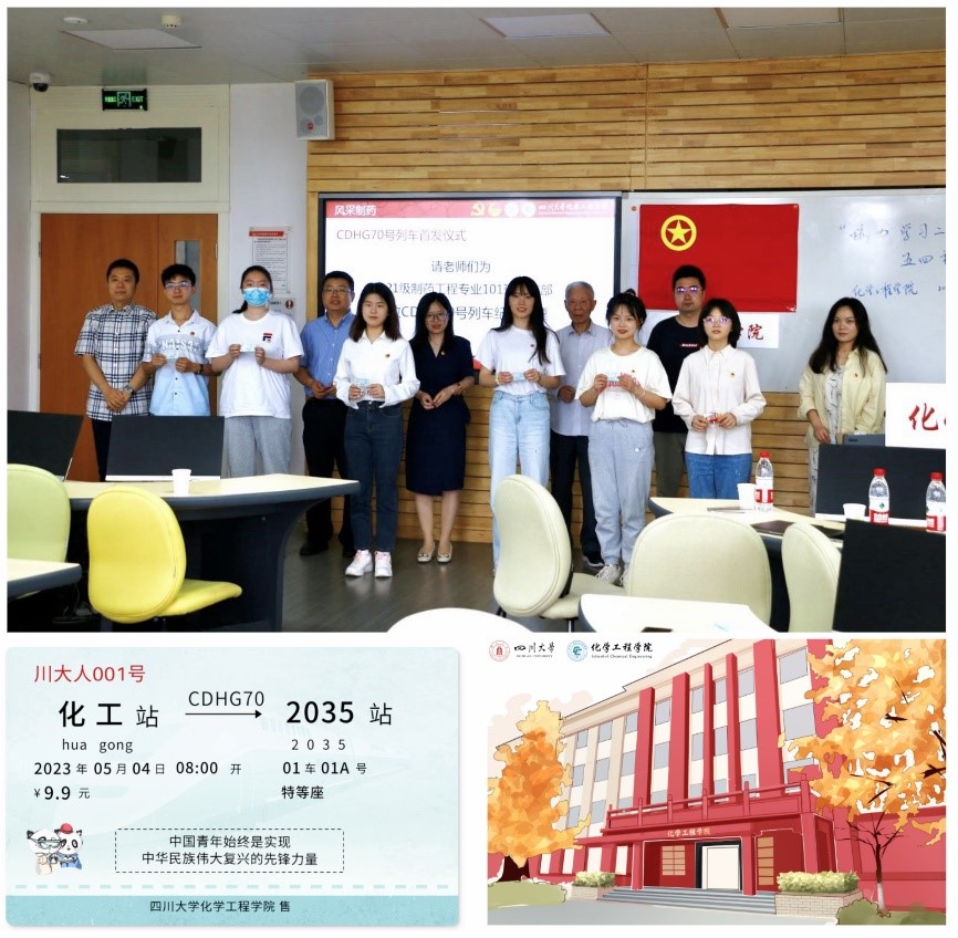 新时代,新征程,我们再出发!车号“CDHG70”代表了“川大化工”已经走过了70年的风雨历程,以“化工站”为始发站,驶向基本实现社会主义现代化的 2035 站。正如习近平总书记所说,“中国青年始终是实现中华民族伟大复兴的先锋力量。”老师们希望同学们以化工为起点,未来在制药领域中大放光彩!全体老师上台为2021级制药工程专业101班团支部全体成员发放CDHG70号列车纪念车票。