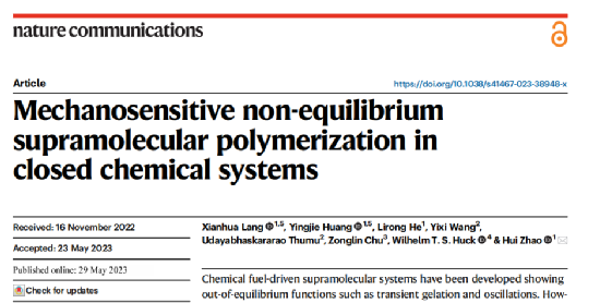 2023年5月29日,Mksport体育app官网入口赵辉教授团队在NatureCommunications上发表了题为“Mechanosensitive non-equilibrium supramolecular polymerization in closed chemical systems”的研究论文。该研究主要通过模拟生命体的动态行为构建了密闭体系中的非平衡态的超分子自组装系统。郎咸华博士和黄英杰博士研究生为该论文的共同第一作者,赵辉教授为文章通讯作者,Mksport体育为第一通讯单位。