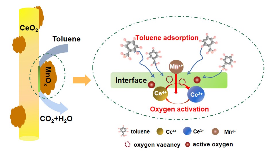 针对多重技术难点,Mksport体育app官网入口唐文翔特聘研究员、唐盛伟教授团队提出构建高效非贵金属氧化物异质界面结构的强化策略,采用简单的湿化学浸渍在纳米CeO2表面进行MnOx纳米颗粒的修饰,从而构建与MnOx的异质界面结构。结果表明:异质界面缺陷及其所造成的不饱和环境(如Ce3+)有助于形成活性氧,而且MnOx的加入能降低Ce-O键的强度,促进Ce4+与Ce3+之间的转化,利于氧的活化与迁移。与没有协同作用的CeO2、负载型的MnOx-SiO2以及物理混合型的MnOx+CeO2相比,新型MnOx-CeO2异质结构催化剂对低浓度甲苯分子吸附能力会得到明显加强。相关成果 “Low-Temperature Oxidation of Toluene over MnOx-CeO2Nanorod Composites with High Sinter Resistance: Dual Effect of Synergistic Interaction on Hydrocarbon Adsorption and Oxygen Activation”发表于Inorganic Chemistry (doi.org/10.1021/acs.inorgchem.2c02738)。