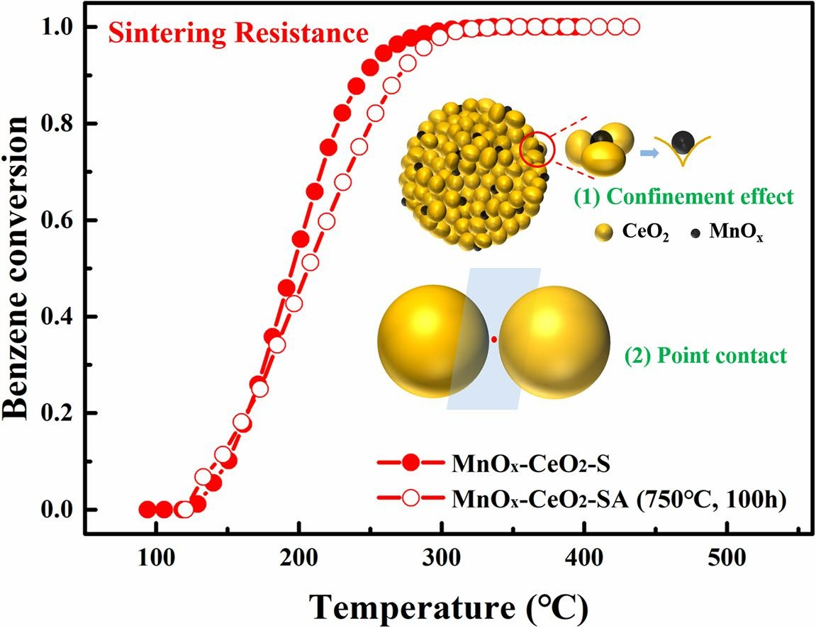 挥发性有机物(VOCs),是近地表O3和PM2.5形成的重要前驱物,其排放会严重威胁生态环境和人类身体健康。深度催化氧化被认为是将VOCs转化为安全物质CO2和H2O的最有效末端处理方法之一,该降碳减污技术的核心是开发兼具低温活性和稳定性的高效催化材料。双碳背景下,贵金属材料减量化和替代化的需求日益迫切,具有较高储氧容量(OSC)和良好氧化还原行为的CeO2脱颖而出。但是纯纳米结构CeO2在降解苯和甲苯等顽固芳烃VOCs时存在低温活性较欠佳的技术难题,而热烧结失活更是成为实际工业应用的关键瓶颈。