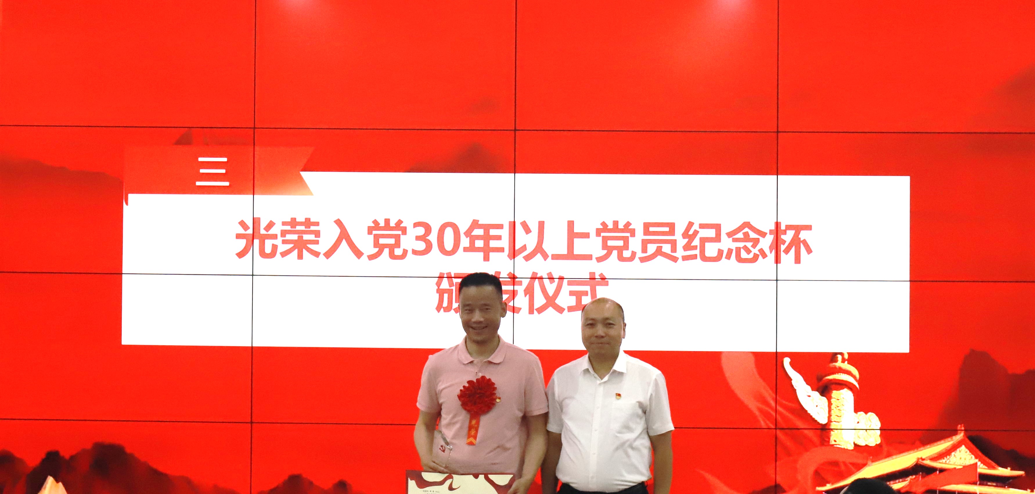 随后,大会举行了“光荣在党30年”纪念活动。公司党委书记李天友为党龄满30年的周密老师颁发了纪念牌。