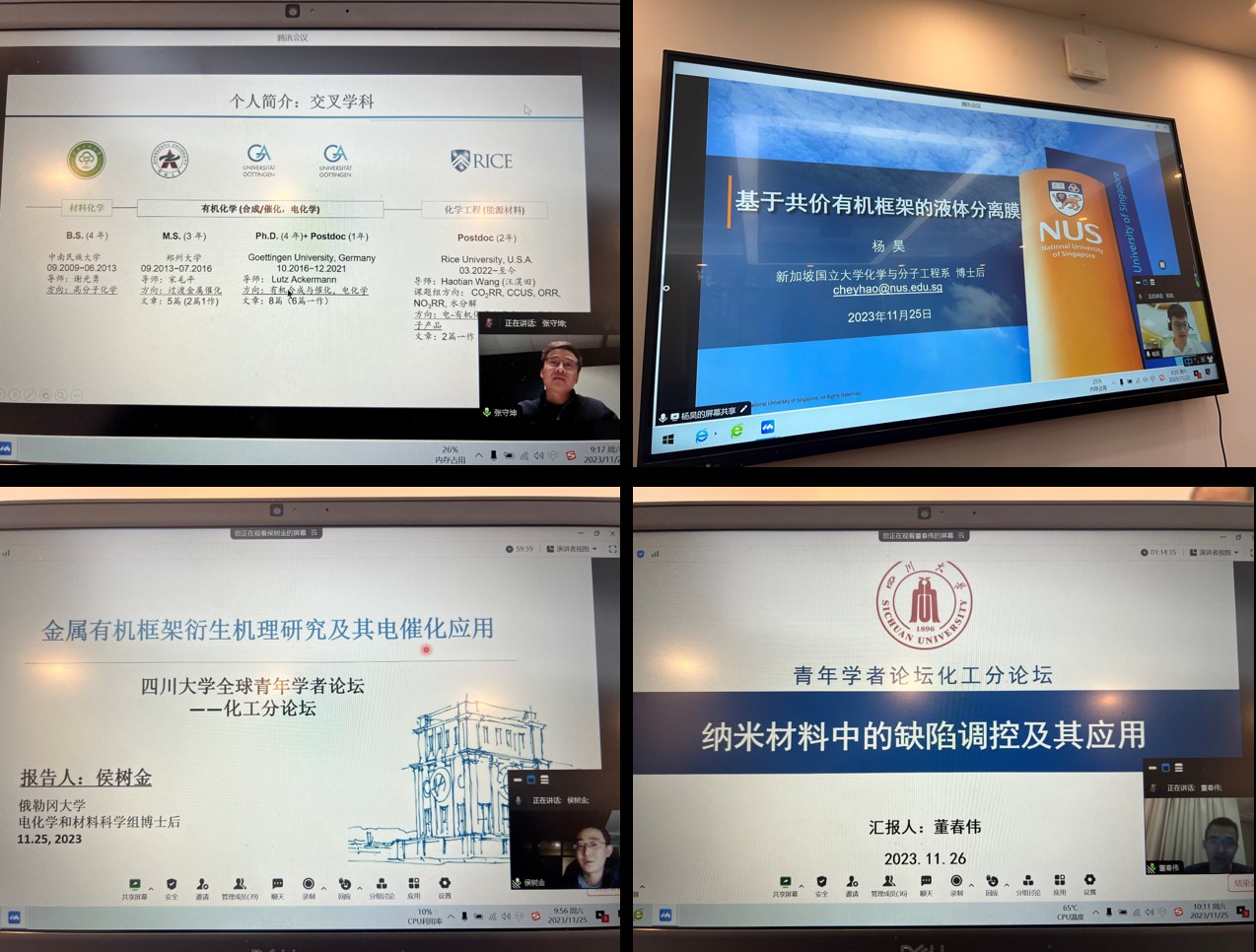 Mksport体育于2023年11月25日上午9点,在望江校区化工楼235会议室,成功召开了Mksport体育app官网入口第十一届全球青年学者论坛——化工分论坛。来自美国莱斯大学、美国俄勒冈大学、美国佛罗里达大学、新加坡国立大学、新加坡南洋理工大学、丹麦科技大学、瑞士苏黎世联邦理工公司、阿卜杜拉国王科技大学、德国马克思普朗克煤炭研究所、清华大学等全球一流高校和科研院所的30多位优秀青年学者与公司师生相聚云端,举行了线上线下相结合的精彩学术报告分享交流会。本次论坛由公司副经理钮大文教授主持。