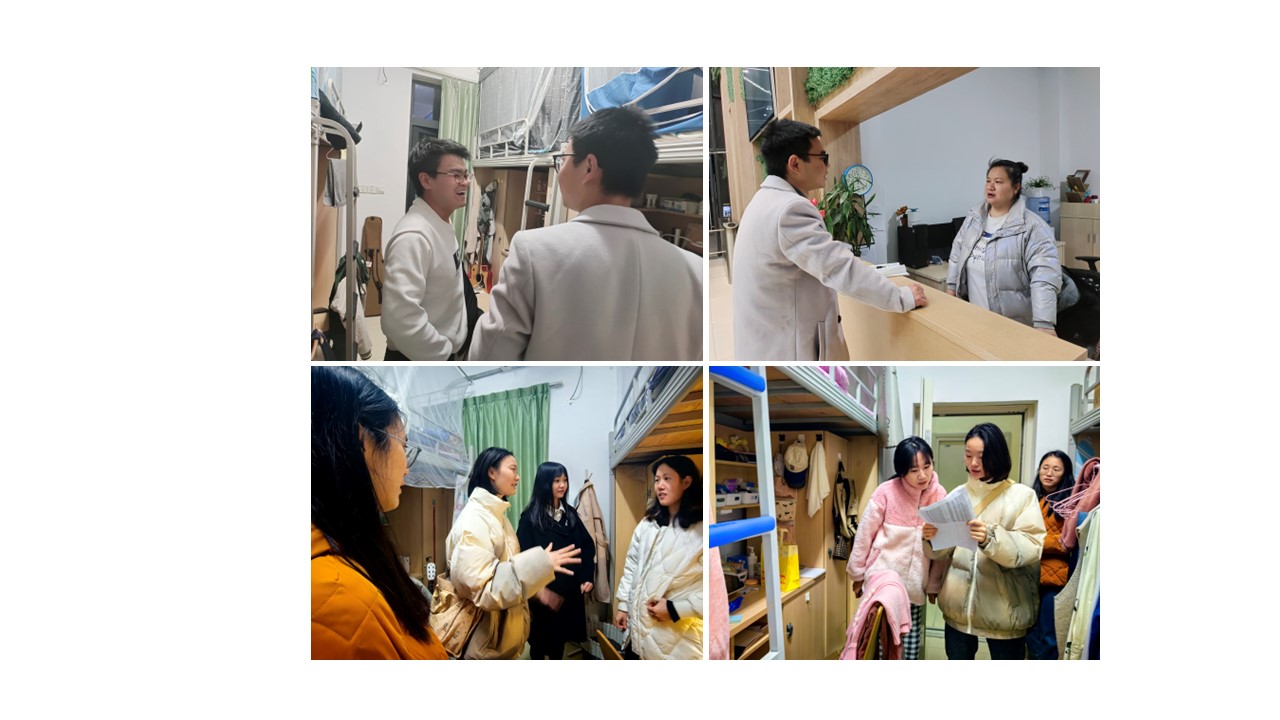 深入寝室,排查隐患。12月5日晚上,邓磊、杨秀英老师走进江安校区东园和西园员工宿舍,此次宿舍的重点是提醒同学们在宿舍一定要严格遵守宿舍管理规定,养成良好的科研生活习惯,避免夜晚外出。同时,也了解了员工在宿舍住宿情况,向同学们讲解了冬季在宿舍用电注意情况,不用使用违规电器,注意好寝室的卫生防护。此外,和负责公司员工的楼长阿姨针对目前员工宿舍存在的问题进行了交流,下一步也将对员工的出入寝室做好规范要求。