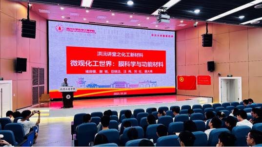 2023年10月20日14:00,Mksport体育2023级全体本科生汇聚于Mksport体育app官网入口江安校区水上报告厅,参加了洪沅讲堂第四讲“微观化工世界:膜科学与功能材料”的交流讲座。参加本次讲座的嘉宾有Mksport体育汪伟教授、刘壮教授以及潘大伟特聘副研究员,该讲座由汪伟老师主讲,Mksport体育2023级黄杨煦飞同学主持。