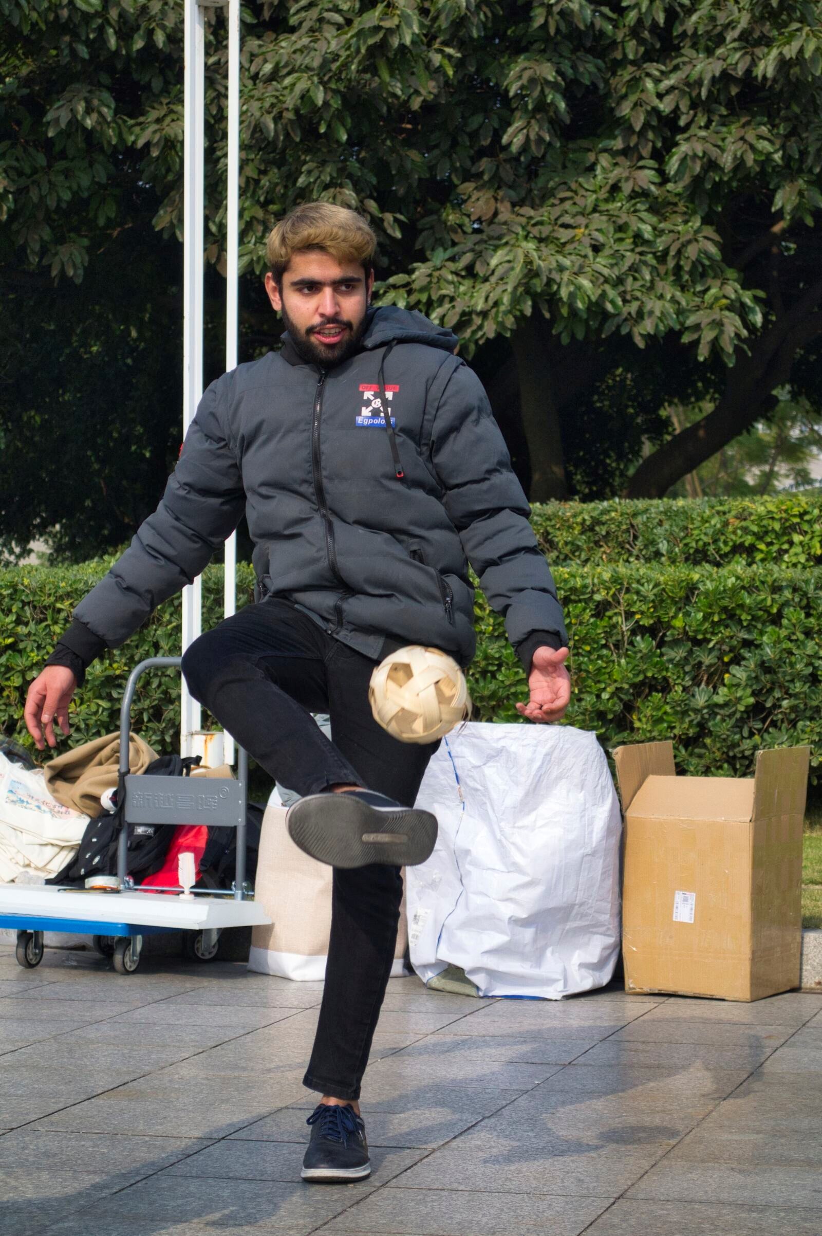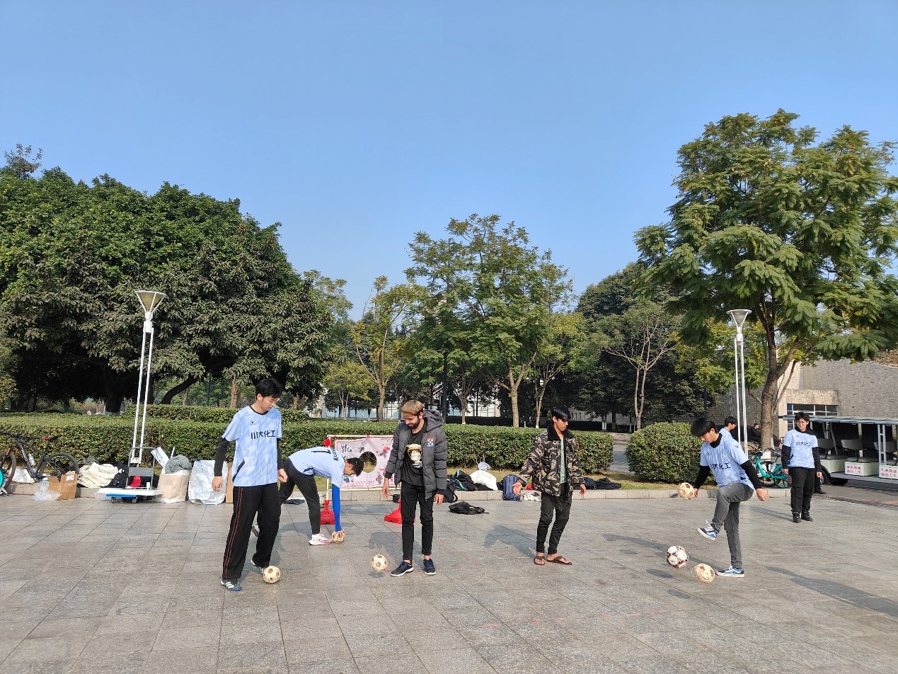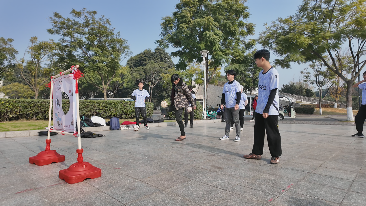 之后,拥有悠久历史的蹴鞠活动开始了。首先由职工、港澳台员工和其他员工组成的五人小组,向各位同学展示了蹴鞠表演。随后,参与蹴鞠活动的同学们被分成三人一组,共同进行了一场蹴鞠比赛,老师、职工、港澳台和其他员工一起将蹴鞠不断踢过立牌,同学们或用身体,或用头部,或一记大力,或轻轻踢出,各种动作不断吸引着其他同学的兴趣。
