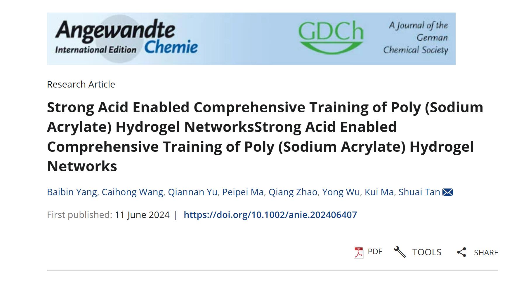 近日,公司谭帅副教授开发了一种强酸耦合机械训练实现聚丙烯酸钠水凝胶综合性能强化的新策略。通过将聚丙烯酸钠水凝胶浸入4 M H2SO4溶液中,强酸溶液耦合机械训练会促使聚丙烯酸钠网络逐渐转化为聚丙烯酸网络,从而形成丰富的动态氢键相互作用。氢键作用赋予了酸浸泡的聚丙烯酸钠水凝胶出色的抗溶胀和自愈性能,并显著提升了其机械性能。相关工作以“Strong Acid Enabled Comprehensive Training of Poly (Sodium Acrylate) Hydrogel Networks”发表在《Angewandte Chemie International Edition》。