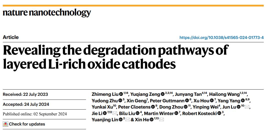 近日,公司Mksport体育何欣研究员团队在国际知名期刊Nature Nanotechnology上发表题为Revealing the degradation pathways of layered Li-rich oxide cathodes的研究文章。通过整合形貌、结构和从单个原子的氧化态演化到次级颗粒的分析,经过纳米尺度到微尺度的表征,确定了与颗粒内非相反应相关的不同结构变化途径。