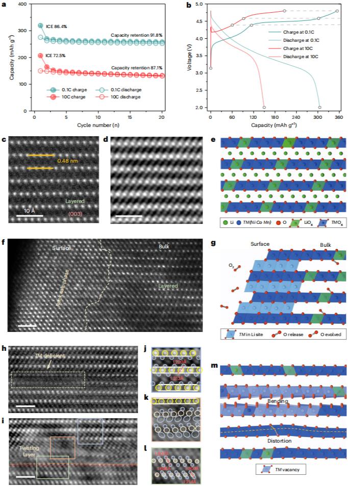 综上所述,在不同的充电倍率下发现了大量的氧缺陷和氧变形,这代表了LRTMO的不同降解途径。氧缺陷发生在缓慢的电化学过程中,以晶格结构转变和纳米空隙注入的形式主导降解。表面的氧释放和体相中的局部扩散是电压衰减的主要原因。在氧缺陷驱动降解的情况下,在快速循环倍率下容量衰减的主要原因是晶格位移/应变的积累和有限的离子扩散,动力学和动力学效应被发现是决定降解途径的主要因素。因此,抑制LRTMO降解的策略应侧重于宿主结构中的反应均匀性、晶格稳定性和离子扩散率。本研究的见解将激发设计高性能正极的新思路。