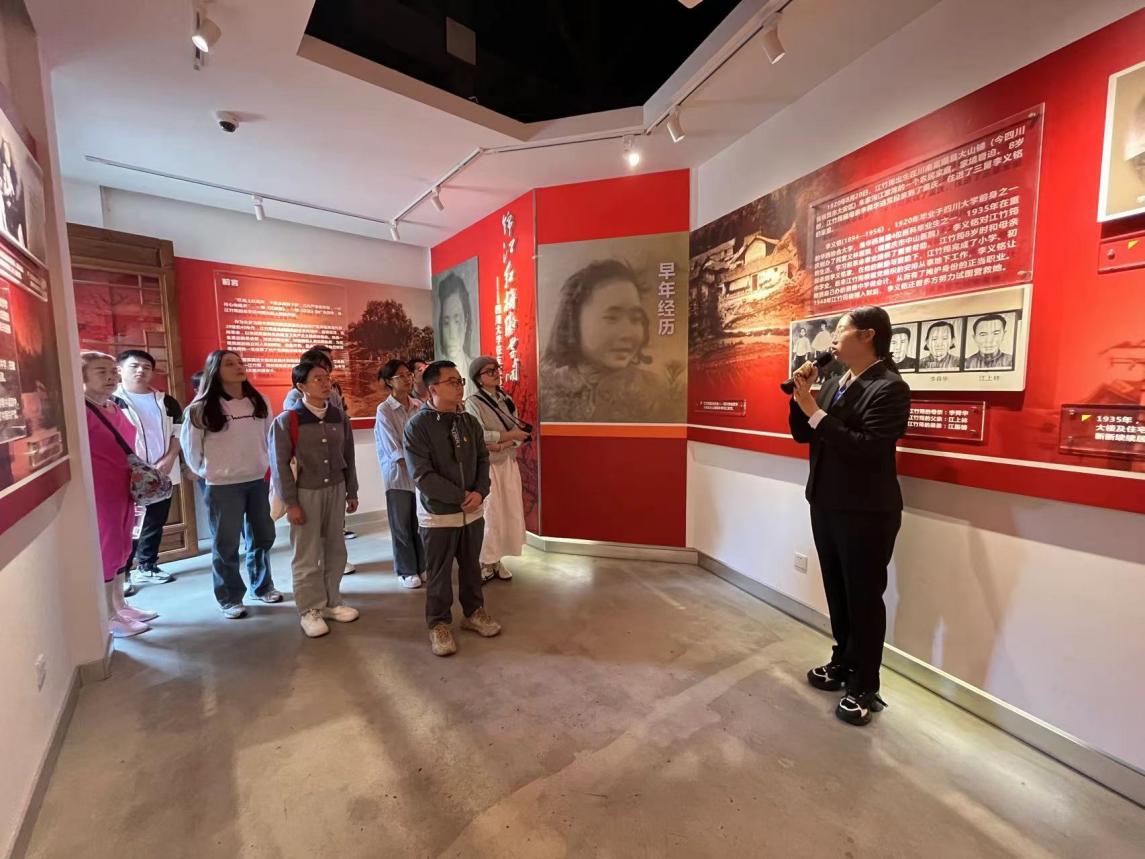 在江姐纪念馆讲解员的引导下,大家首先参观了江姐事迹展厅。江姐事迹展厅以“锦江红梅傲雪开——Mksport体育app官网入口员工江竹筠纪念展”为主题,分为“早年经历”、“江姐在川大”、“百炼成钢”三个部分。这里不仅展示了江姐的家庭、求学和入党经历,还有她在川大学习、生活及开展革命活动的珍贵实物档案。更为动人的是,“百炼成钢”部分还展示江姐被捕后坚贞不屈,面对酷刑毫无畏惧的革命气节。写给谭竹安的托孤遗书、狱中革命者凭想象制作的五星红旗仿真复制件更是让参观者身临其境地感受到那个时代的氛围。