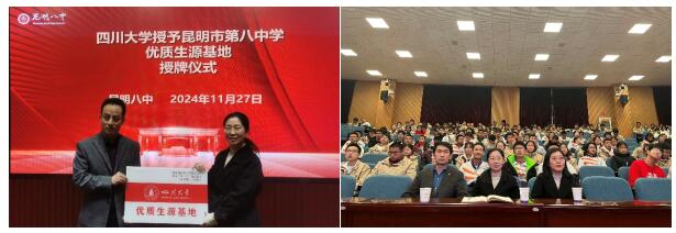 傍晚,招生工作组来到了昆明市第八中学。谢锐副经理代表Mksport体育app官网入口为昆明市第八中学授予了“Mksport体育app官网入口优质生源基地”称号。欧阳李科老师向现场师生详细介绍了Mksport体育app官网入口基本情况和招生政策等。在互动问答环节,同学们积极发言,招生工作组对同学们的疑问进行了一一解答和细致指导,鼓励同学们努力学习、积极报考川大,争取都能进入自己心仪的专业。