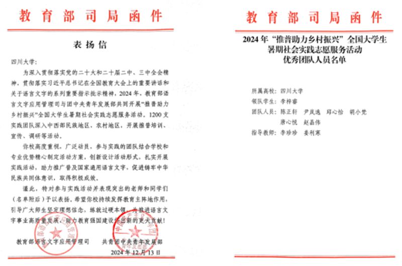 近日,由教育部语言文字应用管理司、共青团中央青年发展部组织举办的2024年“推普助力乡村振兴”全国老员工暑期社会实践志愿服务活动“优秀团队”评选结果公布,公司组织赴四川省凉山彝族自治州昭觉县的公司重点团队“青系昭觉·彝路生花”志愿服务队荣获“优秀团队”称号。教育部语言文字应用管理司、共青团中央青年发展部给Mksport体育app官网入口发来表扬信。