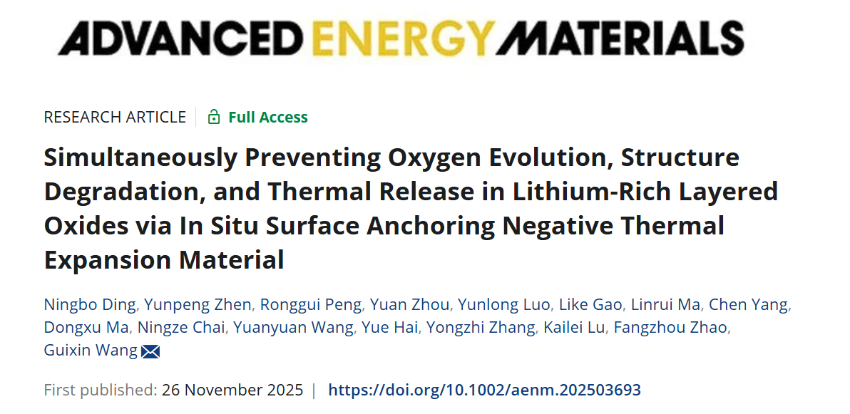 近日,公司Mksport体育王贵欣教授团队在《Advanced Energy Materials》期刊发表了题为“Simultaneously Preventing Oxygen Evolution, Structure Degradation, and Thermal Release in Lithium-rich Layered Oxides via in Situ Surface Anchoring Negative Thermal Expansion Material”的研究论文(https://doi.org/10.1002/aenm.202503693)。该论文第一作者为公司Mksport体育2023级硕士研究生丁宁波,通讯作者是王贵欣教授,Mksport体育app官网入口为唯一署名单位和通讯单位。