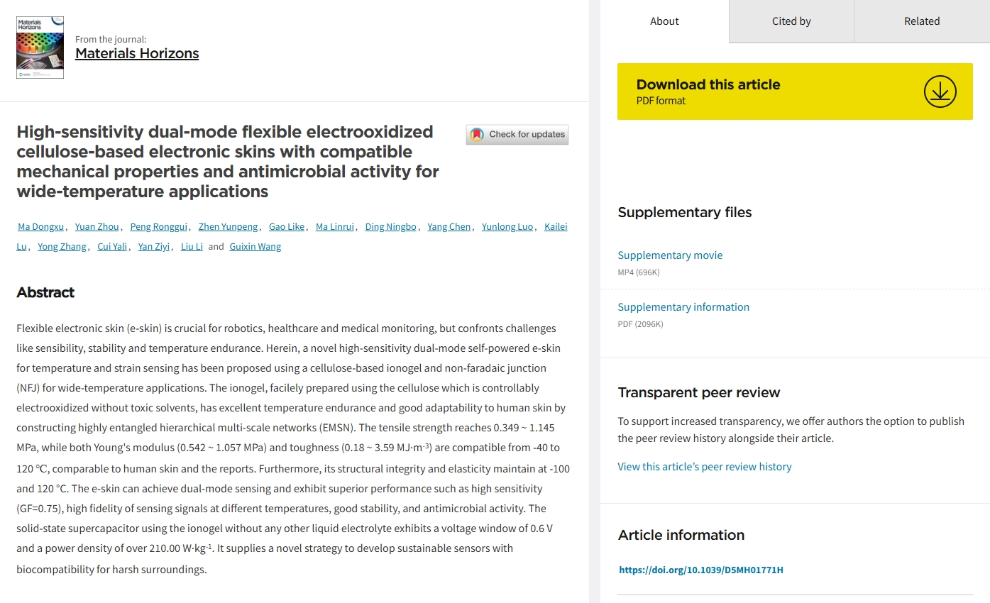 为了进一步提高固态电解质的柔韧性和温度使用范围,研究团队构筑了高度交织层级多尺度网状结构离子凝胶,在-100~120ºC有好的结构完整性和力学性能,将其与碳布组装成全固态超级电容器,在无添加任何液态电解液和无外界压力的情况下功率密度达到210.00 W·kg−1,经过5000次充放电循环后仍保持好的电极/电解质界面和电解质结构完整性。而且,该凝胶固态电解质也表现出好的应变与温度传感性能及抗菌性,为下一代快充电源和可穿戴自供电电子设备的开发提供了新策略。相关研究成果发表在《Materials Horizons》(https://doi.org/10.1039/D5MH01771H)上,该论文第一作者为公司Mksport体育2023级硕士研究生马东旭,通讯作者是王贵欣教授,Mksport体育app官网入口为唯一署名单位和通讯单位。