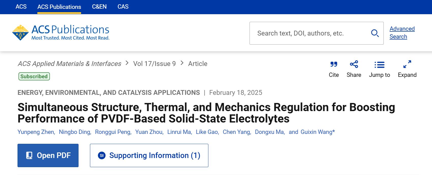 此外,在固态电解质领域,该研究团队基于结构、界面、热和力的协同调控机制,设计开发了负热膨胀材料LiZr2(PO4)3改性的PVDF基复合固态电解质,在不加任何液态电解液和压力的情况下,将制备的新型复合固态电解质与金属锂和不同正极材料组装成全固态电池并展现出好的性能(使用该电解质的Li||LiFePO4固态电池和Li||LiNi0.8Co0.1Mn0.1O2固态电池在25 ℃和0.5 C下的可逆容量分别为133.9和171.6 mAh/g,循环300次和200次后容量保持率分别为90.4和87.7%,循环300 h后的应变分别降低37.7和33.6%。而且,在大电流和高温下也有好的性能),为固态电解质的改性和低成本高性能固态电池的应用提供了新策略和新进展。相关研究成果发表在《ACS Applied Materials & Interfaces》(https://doi.org/10.1021/acsami.4c22175)上,该论文第一作者为公司Mksport体育2022级硕士研究生甄云鹏,通讯作者是王贵欣教授,Mksport体育app官网入口为唯一署名单位和通讯单位。