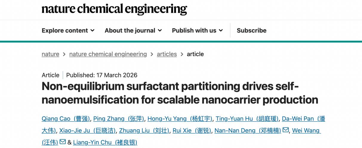 近日,公司褚良银教授、汪伟教授团队与合作者在纳米乳化分散领域取得新进展,相关成果“Non-equilibrium surfactant partitioning drives self-nanoemulsification for scalable nanocarrier production”发表于Nature Chemical Engineering期刊。Mksport体育app官网入口是该论文第一完成单位。