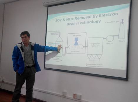 首先,Zhengliang Liu博士针对全球空气污染(二氧化硫、氮氧化物等)的现状,重点讲解了电子束技术在工厂烟气脱硫脱硝处理上的应用,提出电子束技术较传统工艺,具有处理效率高,节能且占地面积小,是未来一体化烟气脱硫脱硝的新技术,具有广阔的市场前景。随后,他分别讲解了电子束技术在废水及固废治理中的应用情况。最后Liu博士与老师和同学就报告内容等展开了深入交流与讨论,并对提出的问题进行了详细解答。