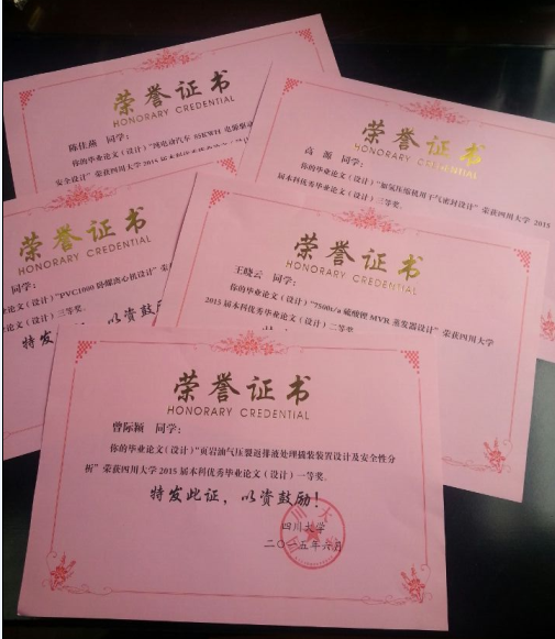 褚良银教授指导刘露月同学完成的《基于仿生材料的温敏表面的制备与性能研究》、黄卫星教授指导潘大伟同学完成的《核电废水TEP系统脱气塔填料流体力学性能研究与传质计算》、宋航教授指导刘维燥同学完成的《新型托品醇类离子液体的合成、表征及其在Dl-苯丙氨酸拆分中的应用》、肖泽仪教授指导曾际颖同学完成的《页岩油气压裂返排液处理撬装装置设计及安全性分析》荣获了本届Mksport体育app官网入口本科优秀毕业论文一等奖。