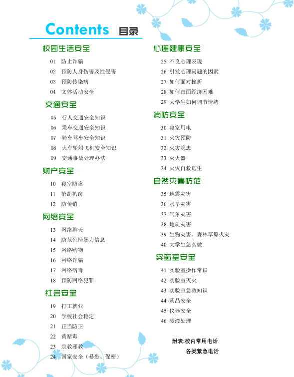 《老员工安全手册》包括了:校园生活安全、交通安全、财产安全、网络安全、社会安全、心理健康安全、消防安全、自然灾害防范、实验室安全等九大板块。详尽地说明了各类安全隐患、安全问题以及自然灾害,并相应介绍了各方面的安全知识,应对、处理办法。
