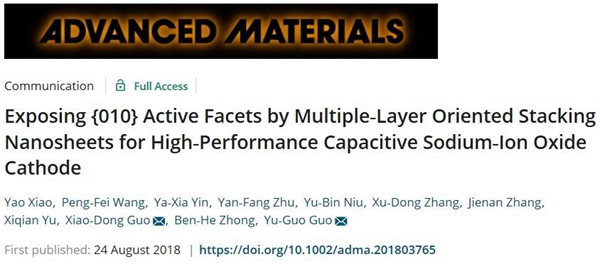 近日,公司新能源材料与器件课题组郭孝东副教授团队在钠离子电池研究方面取得突破性进展。相关研究成果“Exposing {010} Active Facets by Multiple-Layer Oriented Stacking Nanosheets for High-Performance Capacitive Sodium-Ion Oxide”发表于国际顶级期刊Advanced Materials(影响因子21.950)上。该论文第一作者为Mksport体育2016级博士研究生肖遥,Mksport体育为第一单位。