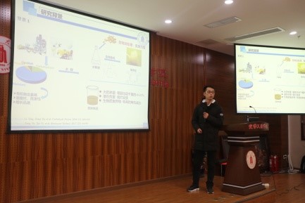 之后,论坛正式开始。来自李晖教授课题组的博士生孙巧媚为大家做了题为《食品添加剂与生物大分子的分子识别过程》的主题报告,介绍了8种食品添加剂在进入人体之后与蛋白质和DNA识别的过程分析;穆畅道教授课题组的博士生葛黎明的报告《纳米银的绿色制备及其在抗菌型胶原基复合材料中的应用》,为大家介绍了使用绿色还原剂双醛黄原胶制备纳米银,并将其应用于胶原基复合海绵材料,该材料在人体具有广泛应用前景;来自埃塞俄比亚的职工Nigussie Alula Yohannes做了题为《Doping Metal Organic Frameworks with Ionic Liquids for Adsorption of Tetracyclines from Water Samples》的报告,他表示离子液体目前在各个领域均具有广泛地应用,将离子液体掺杂金属有机骨架多孔材料可以提高其吸附存储性能,拓宽其应用领域。之后,他表示很高兴参与这样的论坛,也从其他博士的报告中学到了很多东西,希望之后可以继续加强与其他同学的交流。之后,冯雪婷、胡婉蓉、雷金凤、龚贵东、李盼禹分别为大家做了《用磁性离子液体选择性提取和分离茶叶中的茶多酚》、《剩余污泥的减量与资源化》、《明胶基自愈合水凝胶的构建》、《透明质酸包裹环钯化合物纳米胶束的制备及其抗肿瘤活性研究》和《餐厨垃圾的资源化综合利用》的报告。