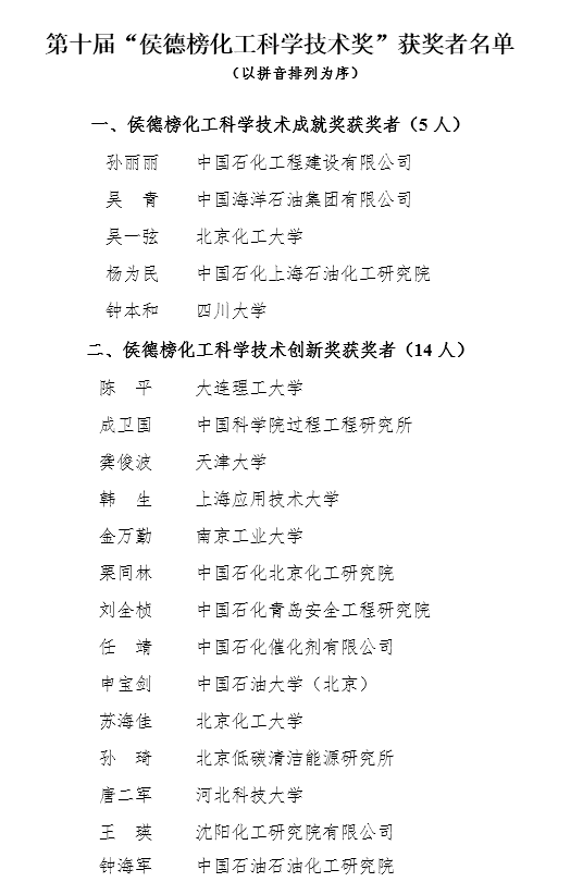 同时,在中国化工学会40届二次理事会上,由中国化工学会组织评选的第十届“侯德榜化工科学技术奖”在京揭晓,48位优秀化工科技工作者获得表彰(详情见下图)。其中,公司杰出教授钟本和等5位同志获得第十届“侯德榜化工科学技术成就奖”。
