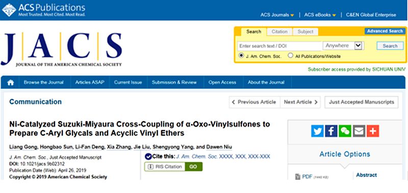 近日,Mksport体育app官网入口钮大文教授课题组在糖类化合物合成上取得了新突破。相关成果“Ni-Catalyzed Suzuki-Miyaura Cross-Coupling of α-Oxo-Vinylsulfones to PrepareC-Aryl Glycals and Acyclic Vinyl Ethers”发表在国际顶级期刊《J. Am. Chem. Soc.》(影响因子14.357)。龚量博士和孙洪宝博士为该论文共同第一作者,钮大文教授为通讯作者。