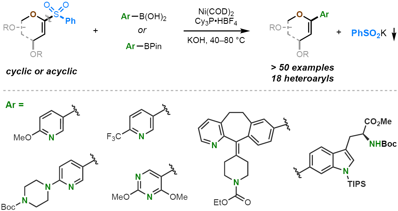 钮大文课题组长期致力于糖类化合物合成新方法的开发。近年来取得了系列成果(Chem,2017,3, 834;Angew. Chem. Int. Ed.,2017,56, 7213;Angew. Chem. Int. Ed.,2018, 57, 320;Angew. Chem. Int. Ed.,2018,57, 9456;Carbohydr. Res.2019,474, 16-33)。近日,该课题组在芳基糖苷的合成方向取得了新突破。该项目中,该课题组开发了可用于Suzuki-Miyaura偶联的新试剂:1–砜基糖烯。该课题组发现,结构稳定、方便易得的1-砜基糖烯可替代传统的结构不稳定且难以制备的1-碘代糖烯用于Suzuki-Miyaura交叉偶联反应,生成芳基糖苷(Figure 1)。此方法可获得一系列传统方法难以制备的芳基糖苷。这些反应可在温和的条件下进行,显示出很好的官能团相容性。除芳基糖苷外,该方法还可以用于合成烯基醚的合成。通过详细的机理研究,该课题组认为邻位氧原子存在对该反应的实现至关重要。