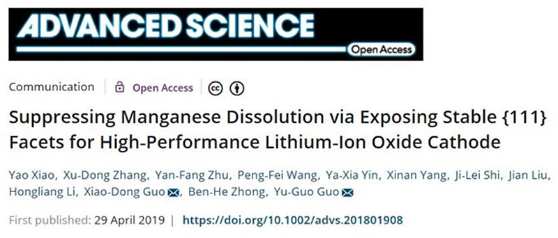 Yao Xiao, Xu-Dong Zhang, Yan-Fang Zhu, Peng-Fei Wang, Ya-Xia Yin, Xinan Yang,Ji-Lei Shi, Jian Liu, Hongliang Li, Xiao-Dong Guo,* Ben-He Zhong, and Yu-Guo Guo*. Suppressing Manganese Dissolution via Exposing Stable{111} Facets for High-Performance Lithium-Ion OxideCathode, Adv. Sci. 2019, DOI: 10.1002/advs.201801908.