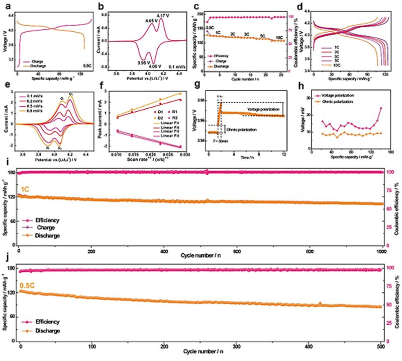 图5a,b)LMO-HF电极在室温0.5C电流密度的首圈恒流充放电曲线和在0.1 mV s−1扫速的循环伏安图。c, d)LMO-HF电极在室温不同电流密度下的倍率性能及不同倍率的恒流充放电曲线。e, f) LMO-HF电极在室温不同扫速下循环伏安图以及峰电流与扫速平方根的线性关系。g, h) LMO-HF电极在室温充电过程中的GITT曲线及相应的不同状态的电压极化和欧姆极化。i) LMO-HF电极在室温1C电流密度的循环性能。j) LMO-HF电极在高温0.5C电流密度的循环性能。
