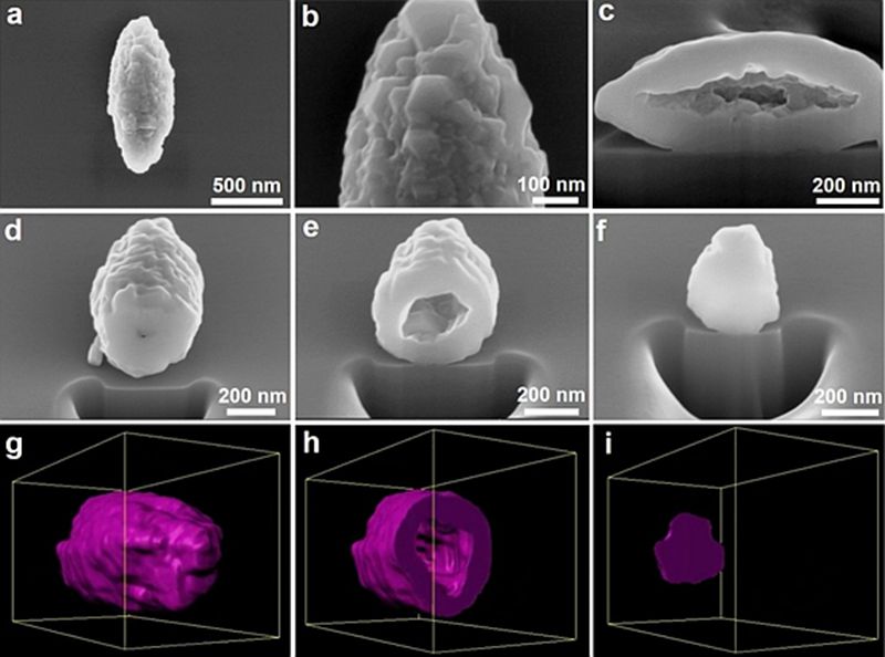 图3.a-f)LMO-HF正极材料在不同位置沿不同角度的截面FIB-SEM图。g-i)在不同状态下截面FIB-SEM的三维重构图。