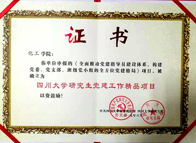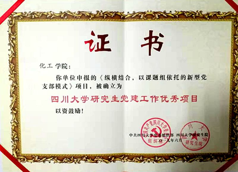 为深入贯彻党的十九大及全国高校思想政治工作会议精神,认真落实《Mksport体育app官网入口关于进一步加强和改进研究生思想政治教育的实施意见》(川大委〔2017〕52号),践行党要管党、全面从严治党的政治要求,Mksport体育app官网入口党委组织部和研究生院共同开展了研究生党建项目评比工作,并于2019年6月24日对研究生党建工作精品项目和优秀项目进行授牌。公司研究生党建工作以《全面推动党建指导员建设体系,构建党委、党支部、班级党小组的全方位党建格局》项目荣获研究生党建工作精品项目、《纵横结合,以课题组依托的新型党支部模式》项目获得研究生党建工作优秀项目称号。