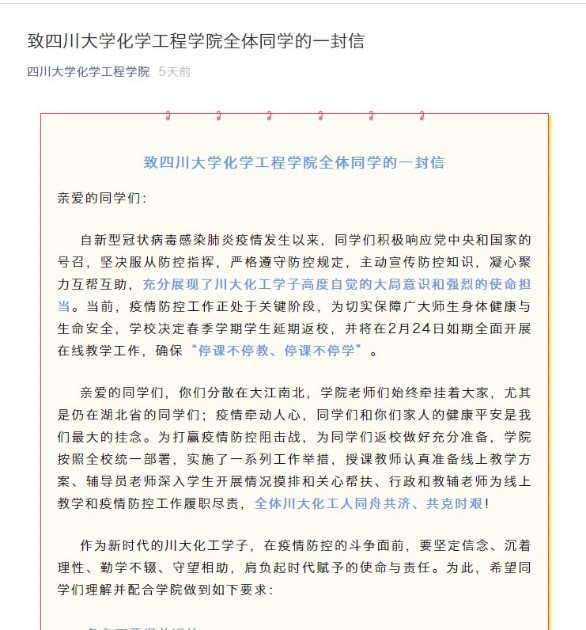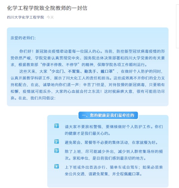 公司党委和公司工会坚决贯彻执行习近平总书记关于新型冠状病毒感染肺炎疫情防控工作重要指示精神和党中央、国务院决策部署,按照教育部、四川省有关要求和《Mksport体育app官网入口防控新型冠状病毒感染的肺炎疫情工作方案(试行)》,积极配合公司做新型冠状病毒防控工作安排,保证公司师生健康和维护正常工作秩序。