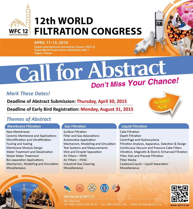 “第十二届世界过滤大会(12th World Filtration Congress (WFC12))”将于2016年4月11-15日在台北举行。该会议是国际上分离领域最重要的大规模定期学术会议。现在大会开始公开征集论文,论文摘要截止时间是2015年4月30日。详情点击http://www.wfc12.tw/submissions.html 请感兴趣的师生报名参加。