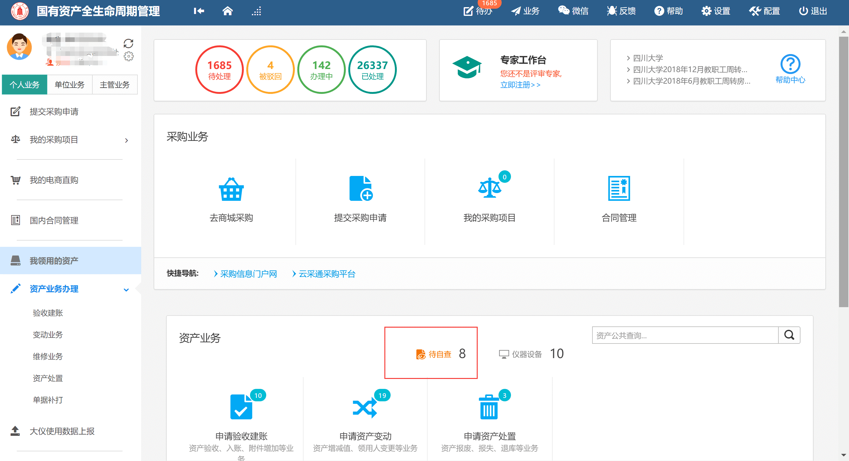 1.教师自查。请各单位每一位老师在仪器设备管理系统中完成设备(仪器设备、家具、图书)自查工作(设备管理系统首页有显示“待自查”任务,如下图所示)。