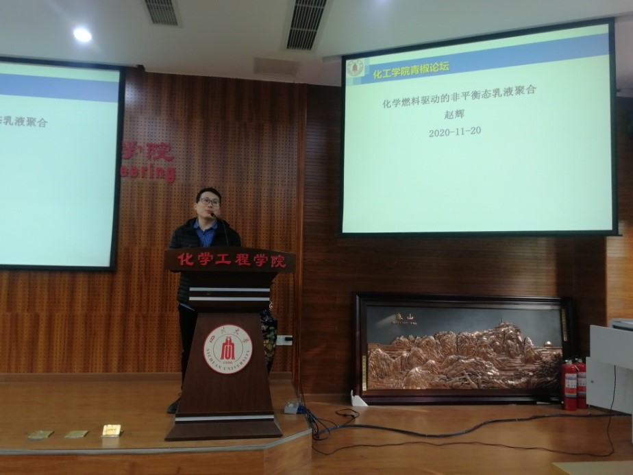 首届化工青年学者论坛中,彭强老师作了题为《有机聚合物太阳能电池》的学术报告,从国家战略需求引入研究背景,详细地讲解了围绕有机聚合物太阳能电池开展的最新研究进展;刘冲老师作了题为《多孔材料中的动态化学过程》的学术报告,细致地讲解了MOF材料的应用前景、基本构造、制备过程和课题组近期的研究进展;赵辉老师作了题为《化学燃料驱动的非平衡态乳液聚合》的学术报告,为解决乳液聚合存在的破乳难题,提出耗散型乳化剂的制备,并发散至非平衡态振荡反应的研究。参会师生就学术报告内容和学科交叉发展等问题展开了热烈而充分的讨论。