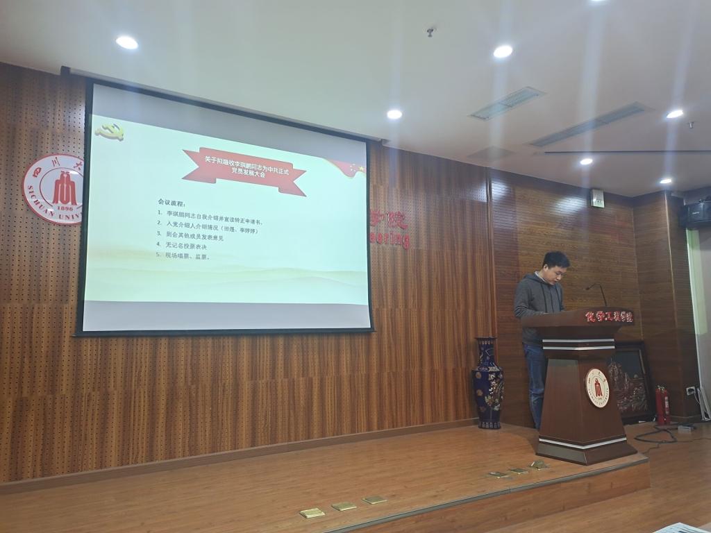首先由李琪鹏同志进行了简要的自我介绍并宣读转正申请书书,针对自己在预备党员期间的学习心得、实际表现等方面进行了汇报。接着,由入党介绍人田煜和李婷婷同志,会上其他同志发表意见,均表示李琪鹏同志在预备党员期间思想端正,学习刻苦,符合正式党员的标准。经支部党员充分讨论并无记名投票后,一致同意李琪鹏同志转为中共正式党员。
